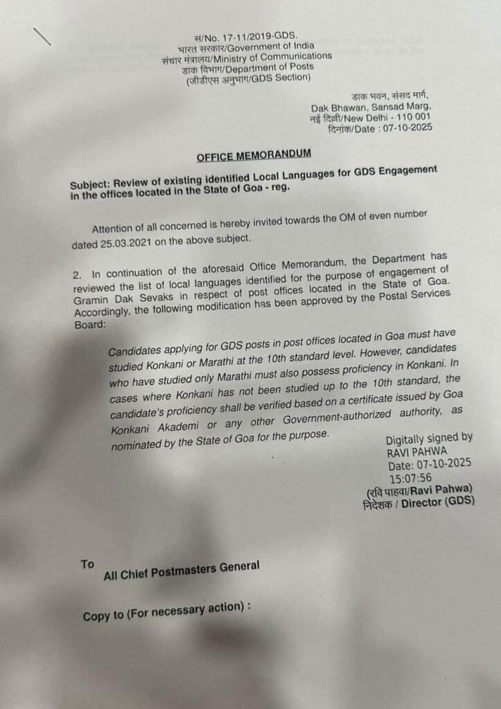 PANAJI: In a significant step to promote the State language and create more employment opportunities for Goan youth, the Department of Posts has made proficiency in Konkani mandatory for all applicants under the Gramin Dak Sevak (GDS) scheme in the state. Chief Minister Dr. Pramod Sawant said the move aims to strengthen the linguistic and cultural identity of Goa while ensuring that postal services remain efficient and community-focused.